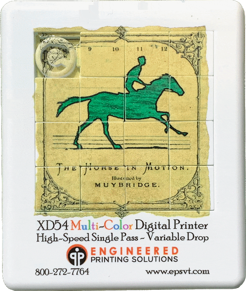 At the InPrint show, EPS demonstrated variable data on a single pass machine by paying homage to the pioneering photographer Edward Muybridge. Muybridge was famous for shooting a series of early photographs of a horse running, and is credited for creating one of the first motion pictures by combining these photographs in a stop-motion film. Kevin Metcalfe of Engineered Printing Solutions created a series of artfiles using Muybridge’s photographs, and we printed the series of 20 images in at 14 inches per second.You can see the result at left.
